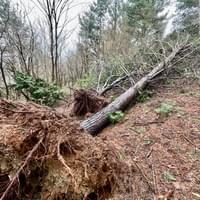Fierce, icy downdrafts swept across the northwest facing slope of Meudon Woods, uprooting and decapitating dozens of trees. The Monterey pines in the new plantation came off worst; other species were affected including five ancient oaks knocked down from the old Cornish hedges that criss-cross the woods.